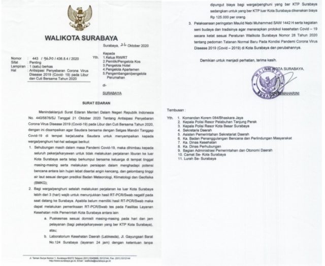 Sedangkan bagi warga penghuni Surabaya yang telah melakukan perjalanan ke luar kota lebih dari 3 hari, wajib menunjukkan hasil RT-PCR / Swab negatif pada saat datang ke Surabaya. “Apabila belum memiliki hasil RT-PCR / Swab, warga dapat melakukan pemeriksaan RT-PCR/Swab test pada fasilitas layanan milik Pemkot Surabaya,” lanjut SE itu.