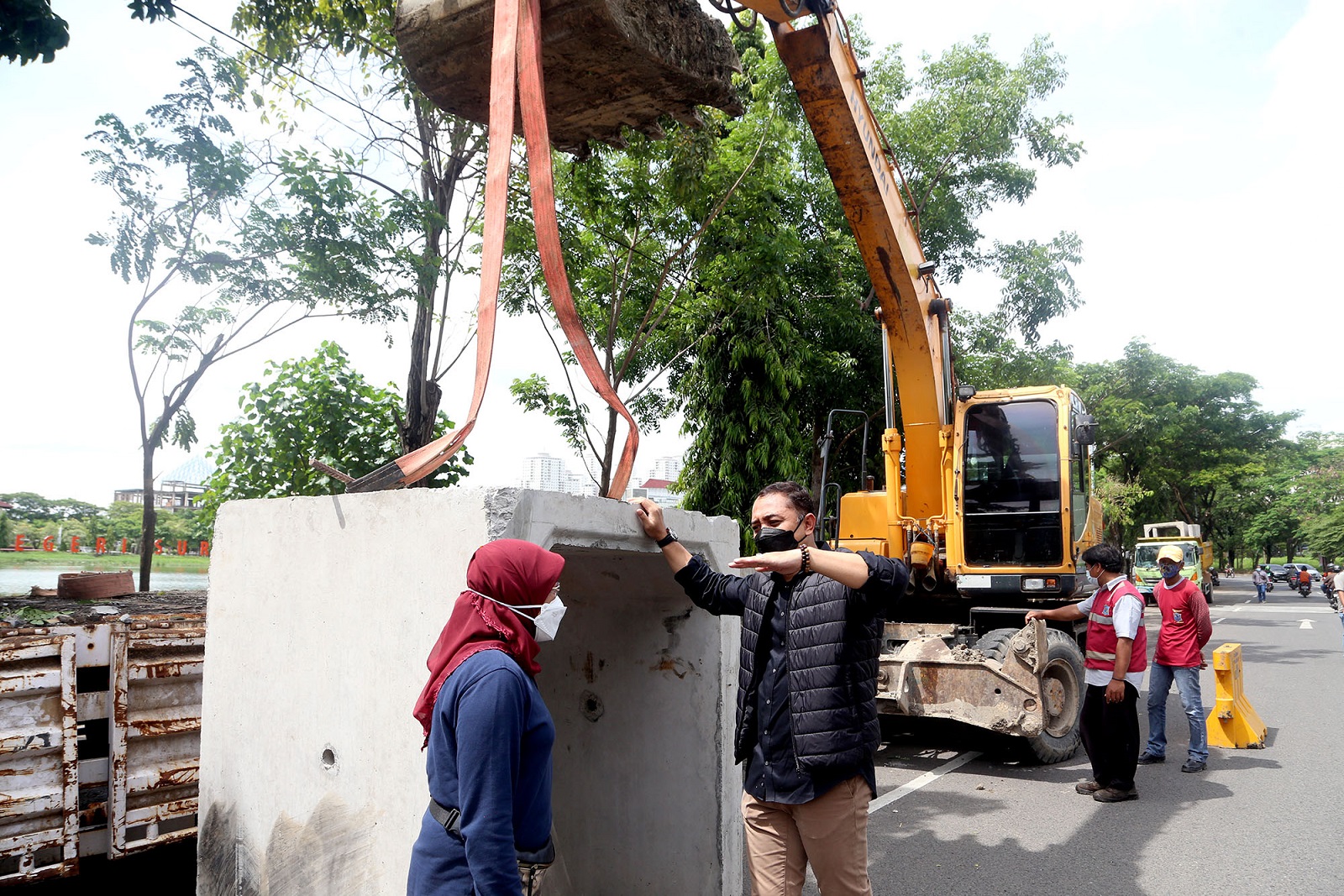 Sedangkan untuk luberan air di Danau Unesa Kampus Lidah Wetan, Wali Kota Eri memastikan bahwa pemkot sudah mulai membuat outlet untuk nyeberang crossing ke sisi timur, sehingga ketemulah dengan saluran Kali Makmur hingga ke Rolak.