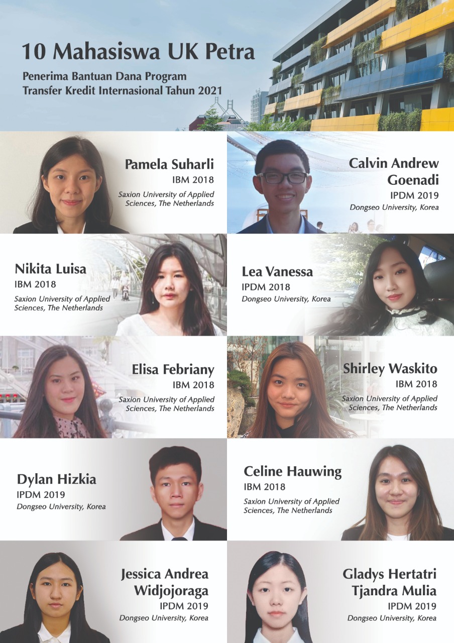 Monika menambahkan 10 mahasiswa UK Petra yang lolos dalam program ini dari program Internasional Busineness Management (IBM) ada lima orang yaitu Celine Hauwing, Elisa Febriany, Nikita Luisa, Shierly Waskito dan Pamela Suharli. Sedangkan lima orang mahasiswa lainnya dari Internasional Program in Digital Media (IPDM) yaitu Calvin Andrew Goenadi, Jessica Andrea Widjojoraga, Dylan Hizkia, Gladys Hertarti Tjandra Mulia dan Lea Vanessa.