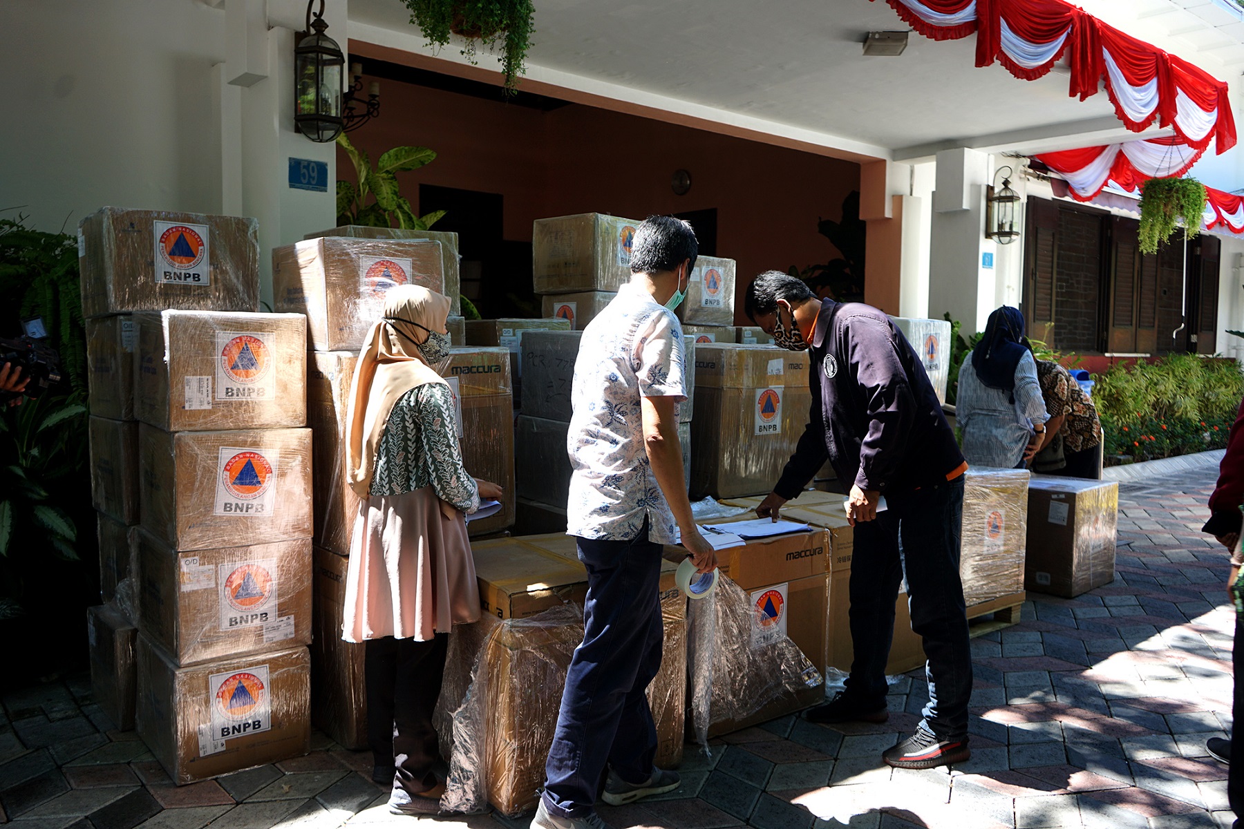 Kepala Dinas Kesehatan (Dinkes) Kota Surabaya, Febria Rachmanita mengatakan, bantuan alat kesehatan dari BNPB tiba hari ini di rumah dinas Wali Kota Surabaya. Ribuan bantuan ini langsung dikirim ke Labkesda Surabaya.