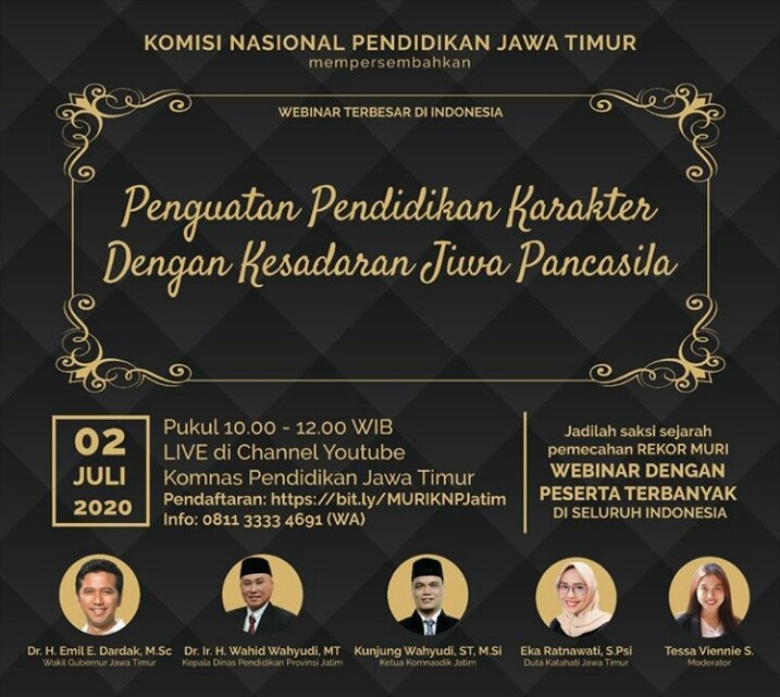 Salah satunya dengan menyelenggarakan webinar Indonesia dengan tema “Penguatan Pendidikan Karakter dengan Kesadaran Jiwa Pancasila pada Kamis 2 Juli 2020, live di channel YouTube Komnas Pendidikan Jatim mulai pukul 10.00-12 WIB.