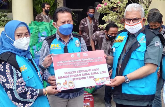 Kegiatan LDP memberikan Layanan Dukungan Psikososial kepada 1.000 anak yang tersebar di 38 Kab/Kota dan memberikan bingkisan/souvenir (dari PT Wings Surya), memastikan kondisi anak dalam keadaan sehat , terlindungi , ada orang tua asuh dan sudah vakin (apabila usia 12 sd 17). 1.000 pendamping/pengasuh anak mendapatkan sembako dari gerakan kepedulian karyawan karyawati Dinas Sosial Provinsi Jawa Timur, memberi solusi terhadap anak yang tidak mendapat/terpenuhi kebutuhan dasarnya (melalui perlindungan dan pelayanan sosial di 4 UPT anak dan 4 shelter perlindungan anak yang ada di Dinas Sosial Provinsi Jawa Timur dan di 760 LKSA yang sudah terkakreditasi) dan Pembagian 2.000 masker sebagai upaya untuk mencegah penularan dan penyebaran covid-19. (*)
