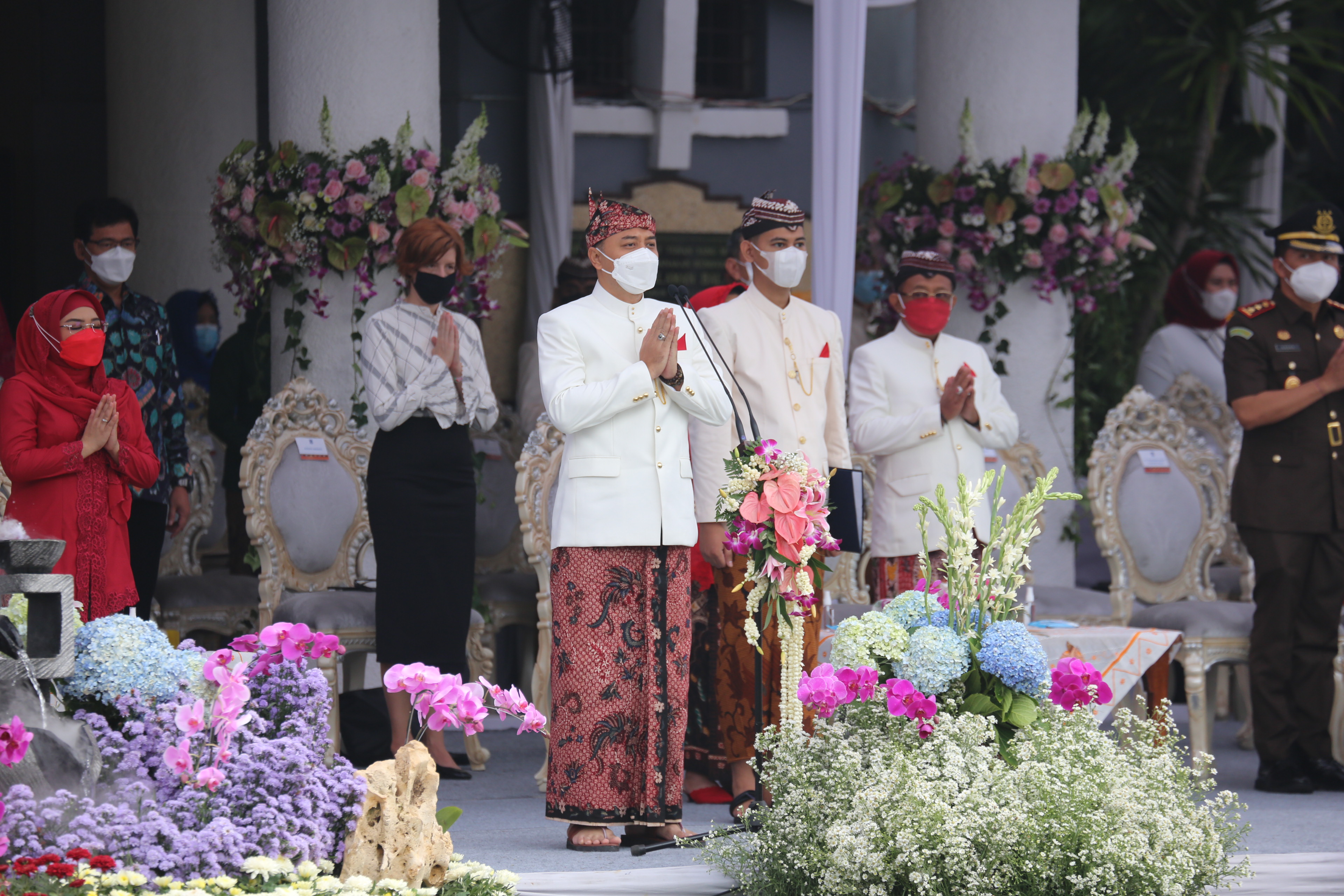 Pemerintah Kota (Pemkot) Surabaya menggelar resepsi Hari Jadi Kota Surabaya (HJKS) ke-728 di halaman Balai Kota Surabaya, Senin (31/5/2021). Karena masih suasana pandemi, para peserta resepsi sangat dibatasi dan harus selalu mematuhi protokol kesehatan yang ketat. Bahkan, tempat duduk tamu undangan sudah diatur sedemikian rupa dengan tetap menjaga jarak dan semuanya harus selalu memakai masker.