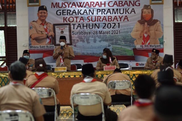 primaradio.id – Melalui aklamasi, Wakil Wali (Wawali) Kota Surabaya, Armuji terpilih menjadi Ketua Kwartir Cabang (Kwarcab) Praja Muda Karana (Pramuka) Kota Surabaya. Hal ini ditetapkan dalam Musyawarah Cabang Gerakan Pramuka (GP) Kota Surabaya 2021 yang berlangsung Minggu (28/3/2021).