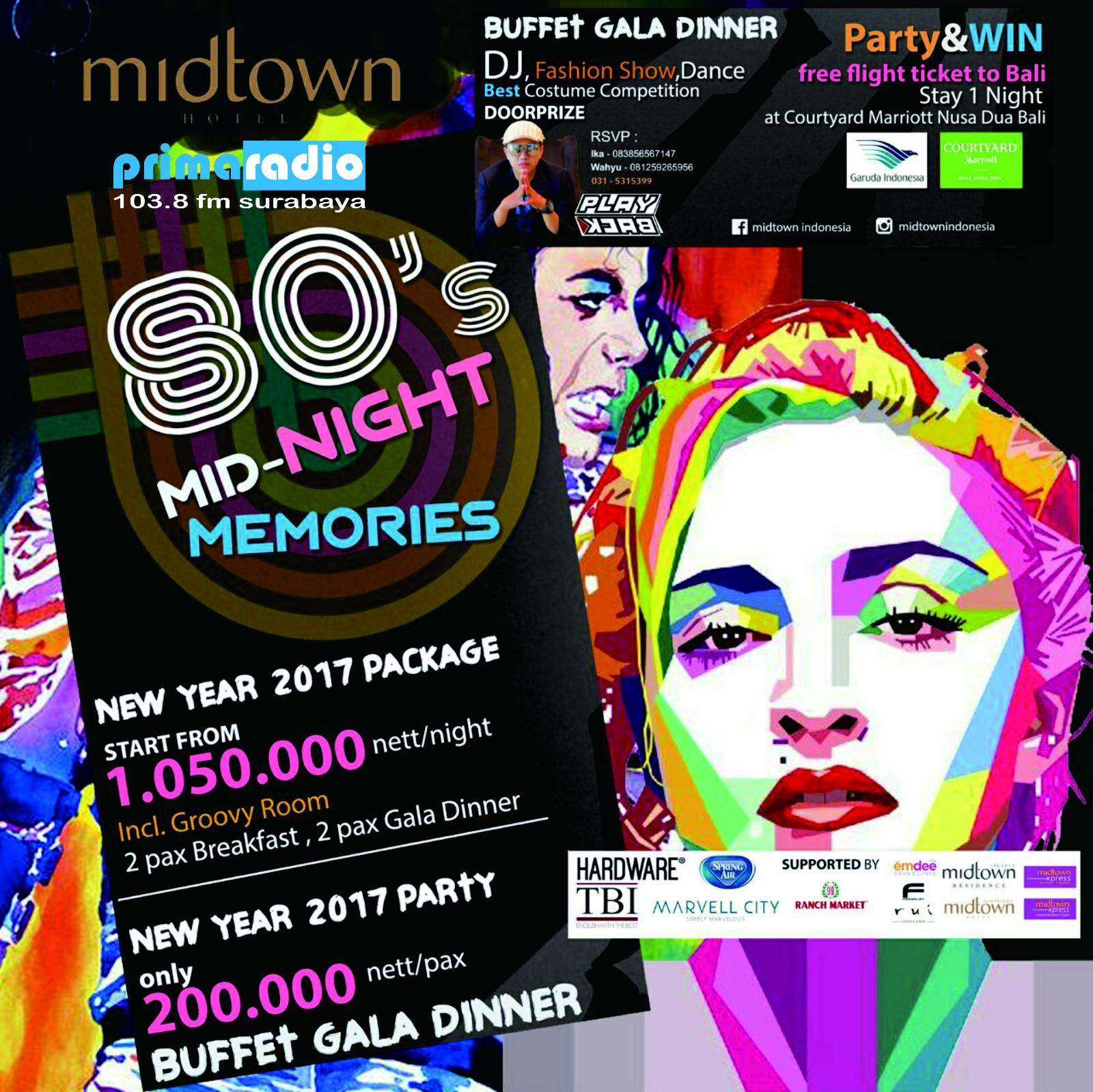 Jadi langsung saja merapat ke Jl. Basuki Rahmat No. 76, Tegal Sari, Tegalsari, Kota SBY, Jawa Timur 60262, Midtown Hotel Surabaya. Nikmati malam tahun baru 2017 bersama dengan teman, sahabat, pasangan, atau keluarga di Midtown Hotel dan nikmati suguhan menariknya.(Joe)