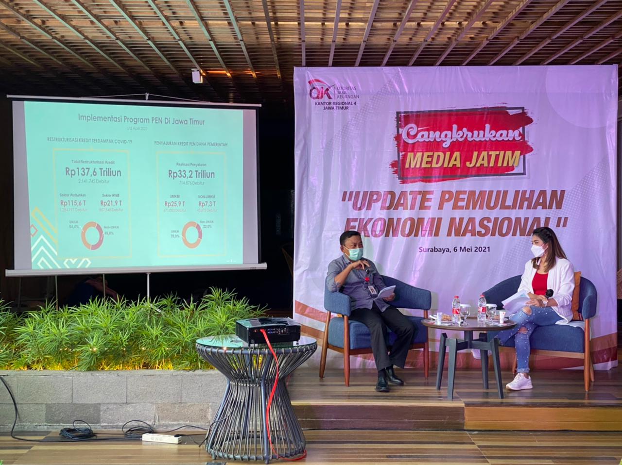 Kepala OJK Regional 4 Jawa Timur, Bambang Mukti Riyadi pada kegiatan Cangkrukan Media dengan tema Update Pemulihan Ekonomi Nasional (PEN) yang dilaksanakan dengan protokol kesehatan di Surabaya menyampaikan bahwa ditengah masih berlangsungnya pandemi Covid-19, stabilitas sektor jasa keuangan di Jawa Timur masih terjaga. Hal ini tercermin dari kecukupan modal dari Bank Umum (BU) dan BPR/S yang berkantor pusat di Jawa Timur yang masih di atas threshold yaitu 21,90% (4 BU), 33,91% (280 BPR) dan 21,90% (27 BPRS). Kestabilan sektor jasa keuangan ini sangat penting untuk mendukung pemulihan sekaligus pertumbuhan ekonomi yang