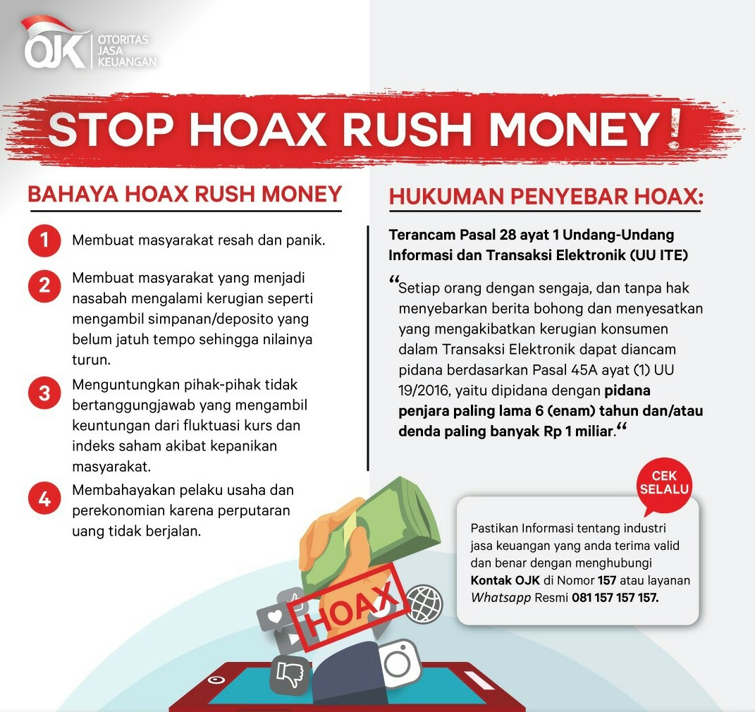 primaradio.id – Otoritas Jasa Keuangan meminta masyarakat mewaspadai beredarnya informasi hoax di sosial media yang mengajak untuk melakukan penarikan dana di perbankan. OJK menyampaikan bahwa informasi yang beredar tersebut adalah informasi hoax dan tidak benar.