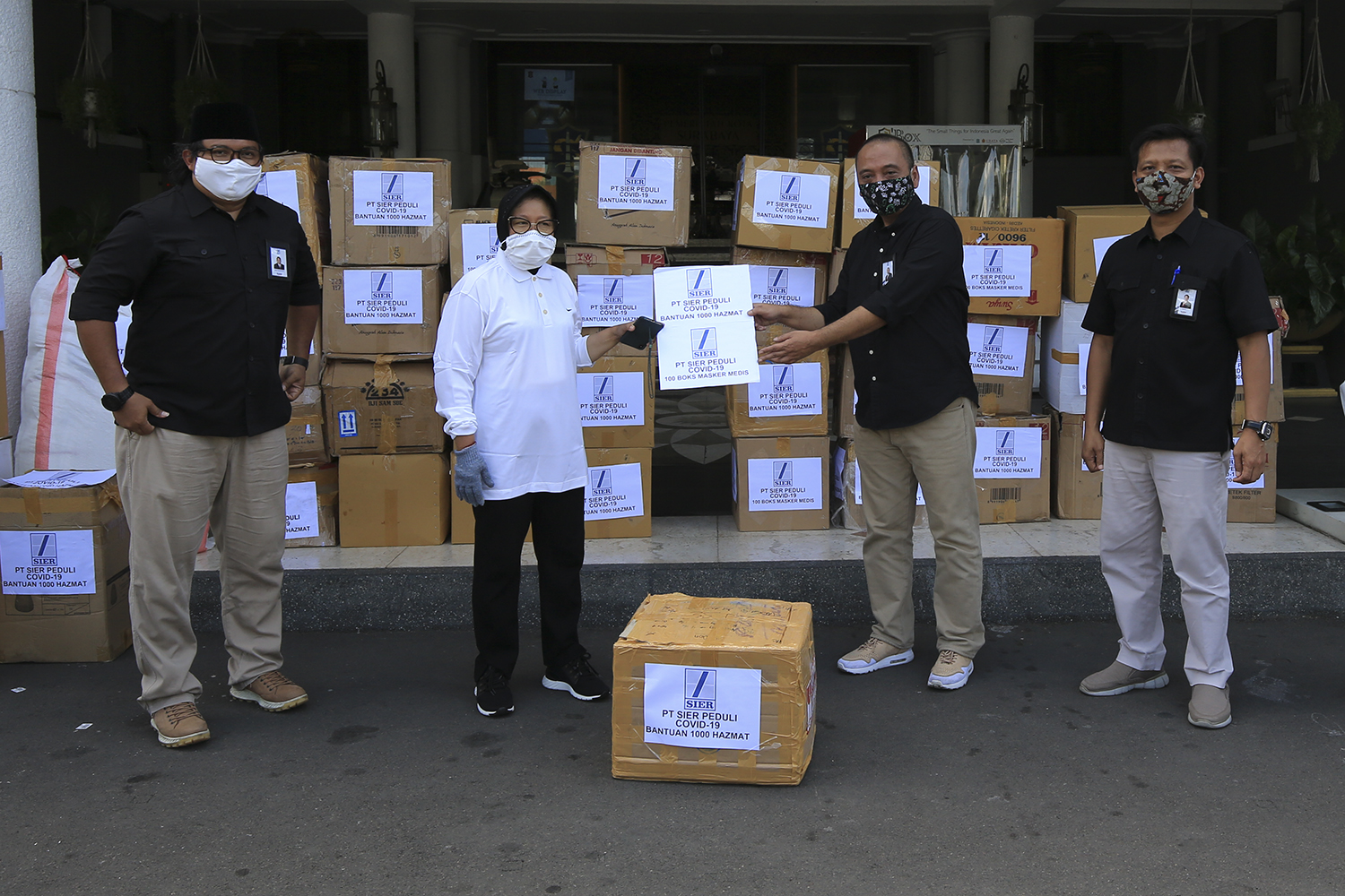 Bantuan tersebut, diserahkan langsung oleh Direktur PT SIER Industri, Fatah Hidayat bersama jajaran direksi kepada Wali Kota Surabaya Tri Rismaharini di halaman Balai Kota Surabaya, Kamis (23/04/2020).