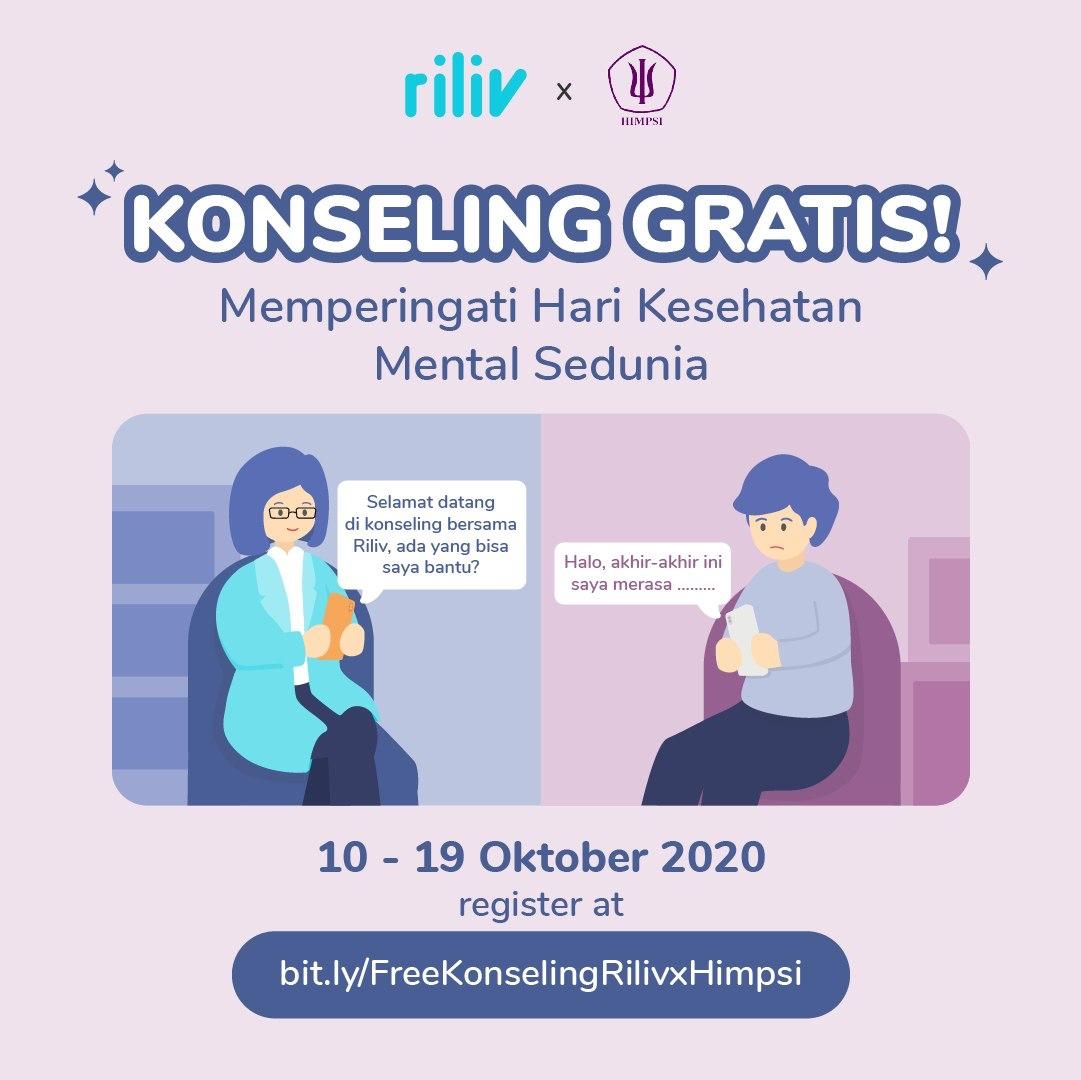 Audrey Maximillian Herli, CEO Riliv menyatakan, “World Mental Health Day adalah puncak acara yang diadakan Riliv dengan memberikan voucher konseling gratis kepada masyarakat Indonesia untuk mendapatkan layanan kesehatan mental. Layanan konseling gratis ini diperuntukkan bagi mereka yang sedang merasa kesehatan mentalnya kurang baik, dan tidak diperuntukkan bagi mereka yang sedang melakukan self-harm atau memiliki niatan untuk bunuh diri.”
