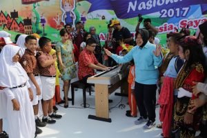 Usai sambutan, Risma mengajak seluruh anak yang hadir untuk naik ke panggung bernyanyi lagu Surabaya oh Surabaya dan lagu nasional Indonesia Tanah Pusaka yang diiringi alat musik keyboard.