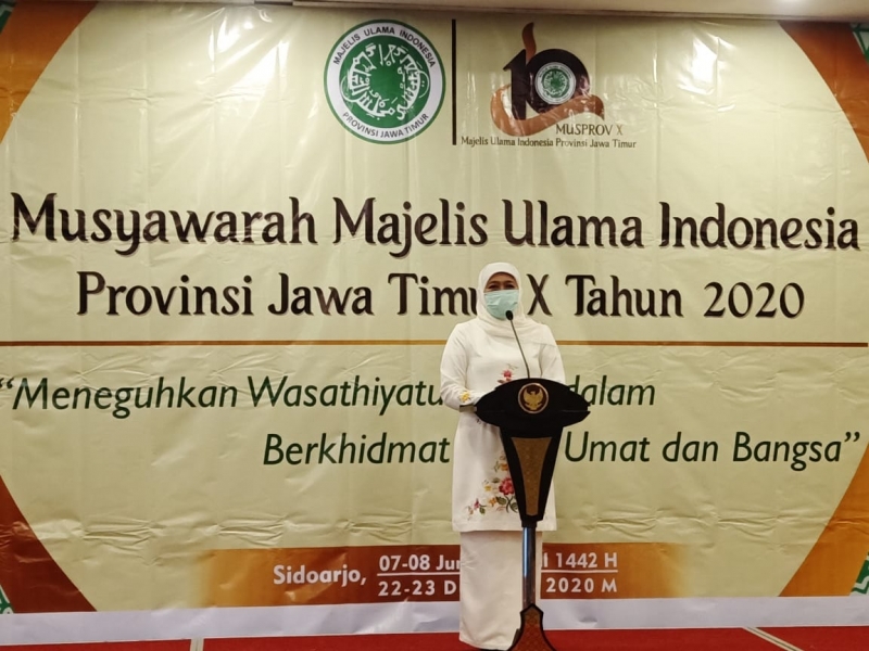 “Selamat, selamat” ucap Khofifah, usai Pembukaan Musyawarah Majelis Ulama Indonesia (MUI) Provinsi Jawa Timur X tahun 2020, di Sidoarjo, Selasa (22/12/2020).