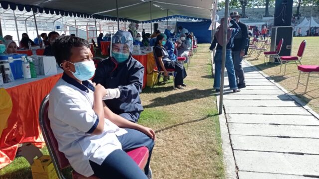 primaradio.id – Pemerintah Kota (Pemkot) Surabaya menggelar vaksinasi massal khusus pelajar SD-SMP usia 12 tahun ke atas di Gelora 10 November (G10N), Kecamatan Tambaksari, Surabaya, Minggu (11/7/2021). Karena sudah dikoordinir dan diundang oleh Dinas Pendidikan (Dispendik) Surabaya, vaksinasi massal khusus pelajar ini nyaris tanpa antri lama.