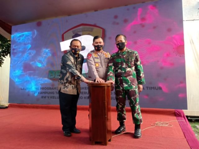 Launching Gerakan Jatim Bermasker dilakukan oleh Kapolda Jatim, Irjen Pol Muhammad Fadil Imran bersama Pangdam V/Brawijaya, Mayjen TNI Widodo Iryansyah. Hadir pula Kepala Bakesbangpol Jatim, Jonathan Judianto mewakili Gubernur Jatim, Khofifah Indar Parawansa saat pencanangan di Kampung Tangguh Semeru (KTS) di Kawasan Mojo, Surabaya, Kamis (8/6/2020).