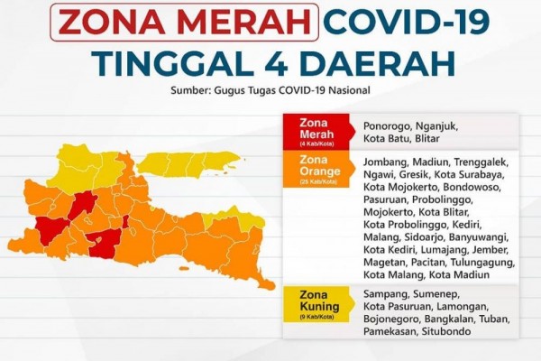 “Data tersebut berdasarkan update dari Satgas Penanganan COVID-19 Nasional sore ini. Dari 38 kabupaten/kota, empat yang masih berstatus zona merah,” ujarnya ketika dikonfirmasi dari Surabaya, Rabu malam seperti dilansir dari Antara.